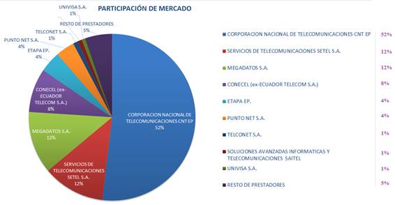 En la década de los 2000 el Internet se empieza a consolidar y las Tecnologías de la Información y la Comunicación (TIC) son más comunes para los negocios. Comenzaron a aparecer nuevos proveedores de internet y cyber cafés en el País. Según la Agencia de Regulación y Control de las Telecomunicaciones (ARCOTEL) hasta marzo de 2018 existen aproximadamente 10 proveedores de Internet con participación en el mercado [7]. En la Figura 1 se puede observar que la Empresa Pública CNT (Corporación Nacional de Telecomunicaciones) absorbe más del 50% de abonados de Internet fijo.