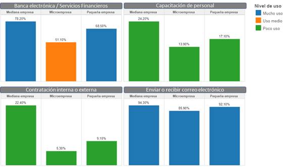 Los datos revelan que el Internet en los tres tipos de establecimientos se usa más para fines administrativos: En cuanto a la banca electrónica y uso de servicios financieros, su utilización en la mediana y pequeña empresa es amplia, en el 78,2% y 68,5%, respectivamente, pero entre las microempresas su uso es intermedio, pues solo el 51,1% de estas lo usa. Se da un poco uso en capacitación al personal y contrataciones internas y externas. Sin embargo, para enviar o recibir correos se tiene mucho uso en promedio un 99,1% en los tres tipos de instituciones.