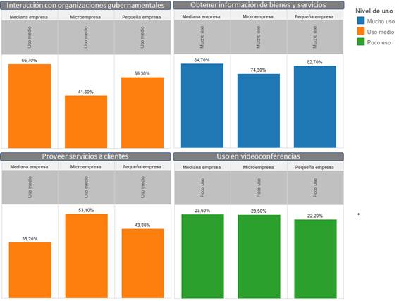 En las siguientes cuatro actividades que se muestran en la Figura 3, se puede observar que la interacción con organizaciones gubernamentales es de medio uso, en promedio de los tres tipos de organizaciones es de 55,60%. En el caso de obtener información de bienes y servicios es donde mayor uso existe, en la mediana empresa (84,70%), seguida de la pequeña empresa (82,70%) y la microempresa (74,3%). De igual manera en la provisión de servicios a clientes es de uso medio, principalmente en la microempresa (53,1%), seguida de la pequeña empresa (43,8%) y la mediana (35,2%). Finalmente, el uso en videoconferencias es bajo, la mediana empresa usa un 23,60%, mientras que la microempresa el 23,50% y la pequeña empresa el 22,20%.
