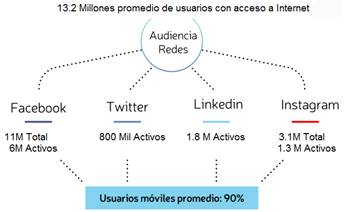 En el 2017, 13 millones de usuarios acceden regularmente a Internet en Ecuador, tanto desde dispositivos móviles como de escritorio. La red social Facebook mantiene el liderazgo absoluto con 11 millones de usuarios registrados, de los cuales, un promedio de 6,4 millones es activos mensualmente, seguido Instagram con 3.1 millones, tercero LinkedIn con 1.8 millones y cuarto Twitter con 800 mil usuarios [10]. Todas estas redes, utilizadas principalmente desde dispositivos móviles (ver Figura 5).