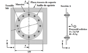 ensayos experimental entre la colisión de una placa de acero y un proyectil, en