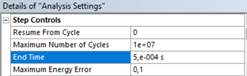 Para facilitar la lectura de resultados, se procede a seleccionar un nodo de la placa de acero como se muestra en la figura 2. Como parámetros de borde se crea una fijación de los extremos de la placa, en la figura 3 se muestra los detalles de “Analisys Settings” donde se limita el evento a una duración de 5 ms sin limitar el número de ciclos, mientras que el proyectil se le incluirá una velocidad en el eje z, cuya variación será de: 54, 77, 148, 165 y, 207 m/s [9]. Para la validación del sistema los resultados experimentales con los simulados no deben tener una diferencia mayor al 10 % [10].