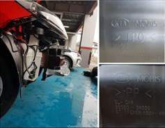 Análisis del funcionamiento del sistema de protección de peatones: en la figura 4 se identifica las partes del sistema como los materiales usados para el LBS y UBS (refuerzo superior de parachoques), pintados de color blanco, el material de fábrica por cada componente es PP para el UBS y TPO para el UBS.