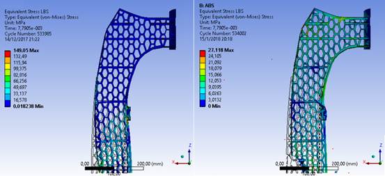 Figura 9. Comparación del esfuerzo equivalente de Von Mises entre PP y ABS.