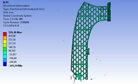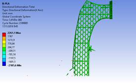 Una manera de medir la disipación de energía es con el estrés equivalente de Von Mises, si bien los autores no lo referencian como factor a considerar en el diseño, puesto que validan resultados experimentalmente con pruebas de Instron para medir corrugación [3], esta propiedad permite evaluar una geometría según la distribución de presión [8]. Analizando el diseño del LBS del Sportage se aprecian hexágonos superpuestos en dirección de la posible colisión, considerando la importancia de disipar la energía en base a la corrugación del material [3][4], por tanto, se deduce que mientras mayor sea el estrés equivalente, el elemento será capaz de soportar mayores cargas. Comparando los resultados con la figura 9, el PP es el material con mayor valor 3,5E+2 MPa sin daños del material, mientras que con el ABS se tiene 3,0E+1MPa y al terminar el evento hay una rotura del mismo.