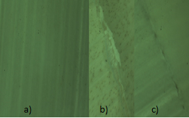 En la figura 1, se muestra las microscopias de inspección de la fibra, en 1.a se ve una cara, donde cada línea longitudinal es una fibra interna y cada espacio entre ellas es una especie de matriz natural, también se ve una rotura de la fibra, comparando en 1.c el anverso y el reverso en 1.b, aquí se ve claramente que el anverso es más resistente y casi no sufre rotura, mientras que el reverso se rompe totalmente, pero se mantiene unido al anverso.