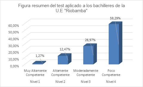 De acuerdo a los resultados globales alcanzados del test aplicado a los bachilleres de la Unidad Educativa Riobamba un mínimo porcentaje se inclina a una valoración de “muy altamente competente” los que corresponden al nivel 1, mientras los que se encuentran en el nivel 2 son “altamente competente” con un porcentaje bajo, en este mismo orden en el nivel 3 son “moderadamente competente” con un porcentaje medio alto y, en el nivel 4 son “poco competente” que corresponden a la gran mayoría.