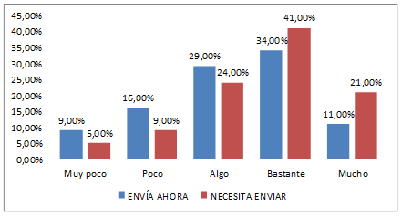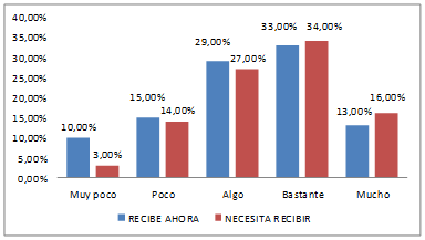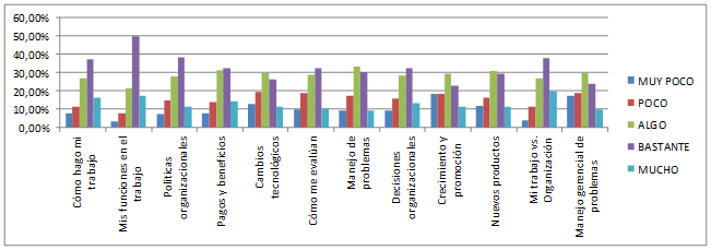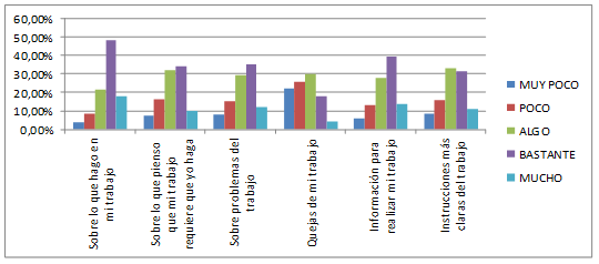 En cuanto al detalle de resultados de la dimensión “Envío de información”, se puede ver claramente que los encuestados consideran necesario enviar más información de lo que ahora ocurre, especialmente en el factor “Quejas sobre mi trabajo y /o condiciones de trabajo”, en donde la diferencia entre lo que hoy se envía versus lo que se considera necesario enviar es del 21.85 %. Este aspecto tiene relación con los resultados encontrados por Lucas [19] sobre la necesidad que sienten los empleados de tener más oportunidades para expresar sus quejas.