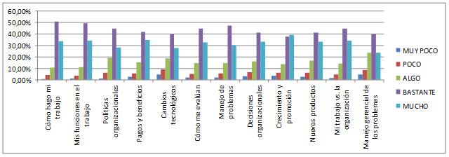 En el caso de los niveles jerárquicos y su relación con la satisfacción general, se observa que un 18.41% de encuestados, que se encuentran en los “mandos medios”, reporta que se siente poco y muy poco satisfecho con los procesos de la comunicación. Siguiendo esta misma línea, en segundo lugar, con un 17.80% se encuentra el grupo de colaboradores que no tiene personal a su cargo.