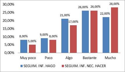 En el caso del “Seguimiento de la información enviada”, es particularmente interesante observar el comportamiento de los factores involucrados, pues al contrastar el seguimiento que los encuestados hacen, de la información con el seguimiento que los mismos consideran que deberían hacer, las diferencias en todos los niveles de respuesta son mínimas; lo que posiblemente señala que, de acuerdo con la percepción de la muestra, esta dimensión se maneja de manera adecuada.