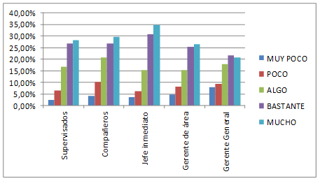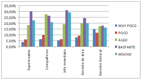 En el análisis pormenorizado, los resultados determinan que el 60.46% de los encuestados concentra el seguimiento que hace de la información enviada a su “jefe inmediato” y, en segundo lugar, el 52.69% lo hace con la información enviada a sus “supervisados”, el 65.56% nuevamente se enfoca principalmente en su “jefe inmediato”, sin embargo, en segundo lugar, se encuentran los “compañeros” con el 56.39% y los “supervisados” pasan al tercer lugar con el 55.09%. Esto puede ser relevante en el caso de organizaciones cuya estructura esté basada en una gestión por procesos en las cuales el enfoque no es intra-departamental y la comunicación entre pares es parte de la responsabilidad compartida sobre el éxito de un proceso.