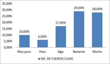 En lo referente a la “Información oportuna recibida de fuentes clave”, los encuestados afirman sentirse satisfechos respecto a la oportunidad de información recibida de fuentes consideradas clave. Esta dimensión hace referencia a que los colaboradores consideran que el origen de la información debe, necesariamente, provenir de fuentes consideradas clave, que en orden de importancia son: “jefe inmediato”, “compañeros” y “gerente de área”. De acuerdo a los hallazgos encontrados por Lucas [19] “Se considera que mientras más alejada es la fuente de información se la considera como fuente menos confiable.