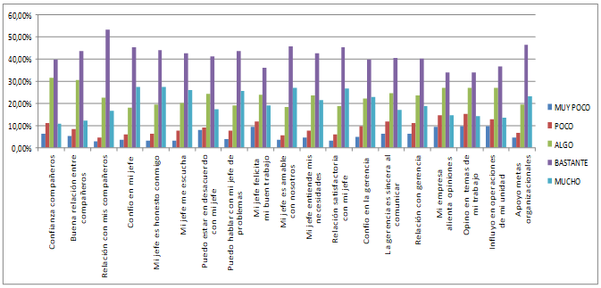 De acuerdo a lo que Carlos Ongallo [21] explica en su libro, Manual de Comunicación para las organizaciones, la comunicación tiene una implicación importante en las relaciones humanas dentro de la organización, ya que es mucho más que una transmisión de información. La comunicación demanda establecer relaciones entre las personas porque facilita sus acciones individuales y colectivas; es más, según el mismo Ongallo, esta comunicación debe ser consciente, direccionada con un tipo de gestión determinado. En este mismo sentido, los resultados reflejan que la percepción de los colaboradores sobre la confianza y reciprocidad en los procesos comunicacionales al interior de cada organización es alta.
