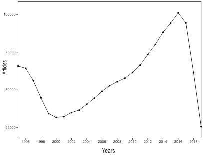 Tabla 1. Número de publicaciones con la etiqueta complex sciences entre 1995 y el 2018 (incluye parte del 2019)