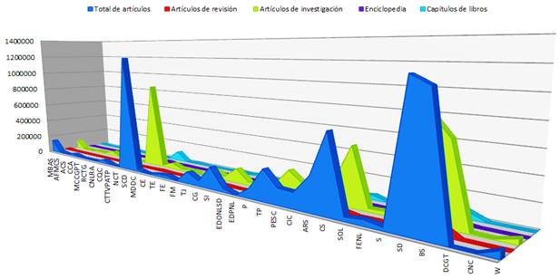 La figura 2 evidencia las relaciones entre los 35 campos de las CCS. Se observa la superioridad del volumen de producción de los SCD, la SD, y la BS, su relevancia se presenta en las variables total de artículos y artículos de investigación. En este último indicador el nivel publicación es desbordante: los SCD aparecen con 882978 entradas, la SD presentan 846.469 items y la BS reporta 671,376 trabajos. Sin embargo, un campo emergente como lo es la computación suave (CS) obtuvo un sorprendente número 526.731 de reportes investigativos. Asimismo, los campos del ARS el cual obtuvo un decoroso número de 220.246 entradas y la teoría de la perturbación (TP) presenta un importante número de 226.236 trabajos publicados en la misma variable.