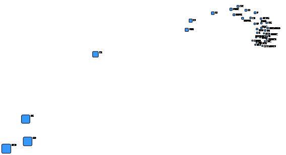 La figura 5 presenta el agrupamiento de los nodos –como se puede observar– y refleja una cercanía de tipo euclidiano en un espacio métrico por ende topológico en dos dimensiones sobre los datos establecidos, lo cual refleja las distancias entre los campos de las CCS a partir de las similitudes que componen el conjunto de datos presentados, identificados como puntos azules –como se dijo de diferentes tamaños– en el espacio de la red. Las distancias se obtuvieron de las relaciones entre los 5 items seleccionados para el análisis y presentaron un stress inicial de 0.094361997 y un stress final de 0.049 después de 12 iteraciones. En este contexto el stress es la cantidad de distorsión de un mapa, por lo tanto el objetivo de los algoritmos de escalado multidimensional es reducir el estress [17]. La figura 5 también ejemplifica la cercanía en términos de la producción científica de los 28 campos restantes que conforman las CCS.