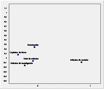 Por otra parte, la figura 6 también presenta que el conjunto de los datos muestra con mayor relevancia la variable artículos de investigación. El poder de esta variable indica el fructuoso panorama investigativo de las CCS en el contexto internacional. Este prometedor panorama se relaciona con el amplio número de centros de investigación de las CCS ligados a las principales academias del planeta, el alto nivel de sus presupuestos conceptuales y metodológicos, y el constante flujo de saberes qué de modo general recorren la transdisciplina compleja.
