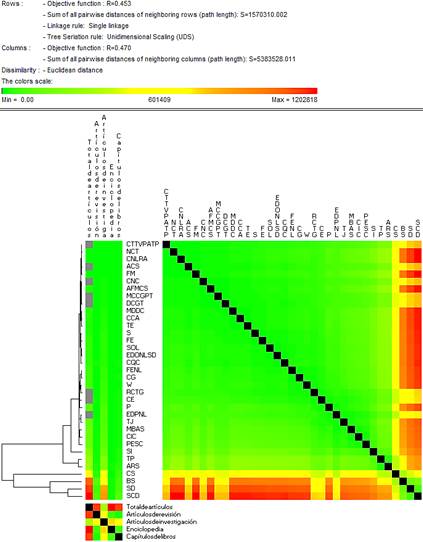Los criterios de optimización para esta implementación son los siguientes. Las filas contienen un objetivo de función que presenta un coeficiente de Pearson R = 0.453, una longitud de la trayectoria (la suma de la distancia entre pares de filas vecinas) S = 1570310.002 y las columnas presentan un indicador de R = 0.470, una longitud de la trayectoria S = 5383528.011 con disimilitud a partir de una distancia euclidiana. Se empleó una regla de enlace (linkage rule) de vinculación simple (single linkage) también conocida como vecino más cercano (nearest neighbor), y una regla de seriación arbórea de escalamiento unidimensional (unidimensional scaling UDS) con un método de discriminación numérico.