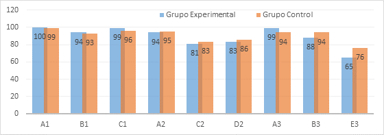 El cálculo se hizo transformando en porcentajes los segundos de la variable tiempo y la frecuencia de la variable fluidez de cada estudiante, y dividiendo cada una de ellas por el máximo correspondiente a la variable tiempo y la variable fluidez de la Tabla 1, en la lectura de palabras y en la de lectura de pseudopalabras, del grupo experimental y del grupo control, para obtener el porcentaje relativo de cada grupo y por tanto contar con valores comparables entre ellos.
