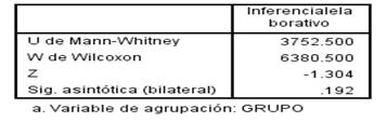 De acuerdo con la la U de Mann-Whitney, el valor p=0.192, mayor que 0.05, es decir, no se rechaza la Ho, por tanto, el nivel de comprensión inferencial elaborativo es igual (z=-1.304, p>0.05) entre el grupo control y el grupo experimental.