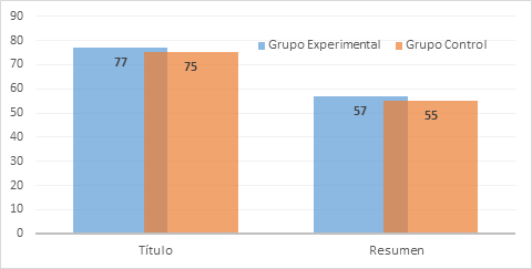 La figura 5 muestra el promedio de respuestas correctas obtenido en los ítems de selección del título y de identificación del resumen de los tres textos evaluativos. Ambas tareas, según Defior y otras [16], evalúan el reconocimiento de la idea principal, que implica un proceso de comprensión inferencial elaborativa. Los porcentajes entre los grupos fueron similares, mostrando mejor rendimiento en la selección del título, con un promedio general de 77% (75% el grupo experimental y 77% el grupo control), en comparación con el 56% (55% de grupo experimental y 57% el grupo control) en el reconocimiento del resumen.