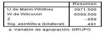 La tabla 10 muestra el valor de p=0.491, mayor que 0.05 por lo que tampoco en este caso se rechaza la Ho, de tal forma que se puede decir que el nivel de identificación de los resúmenes es igual (z=0.903, p>0.05) entre el grupo control y el grupo experimental.
