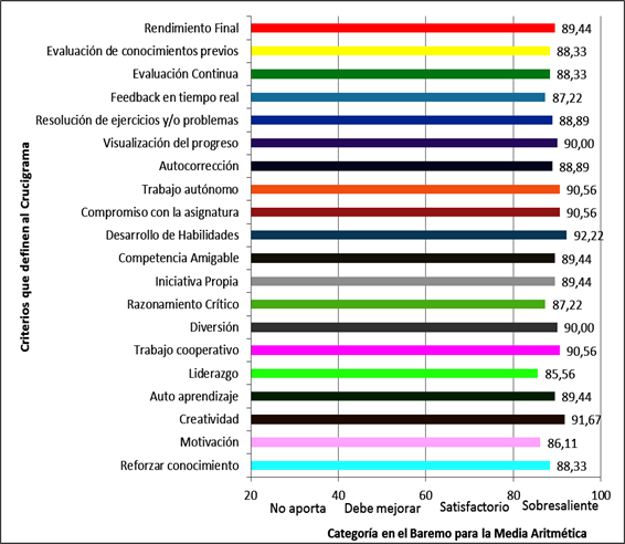 En la figura 4 se muestran los resultados asociados a la media aritmética de los criterios, considerados en este estudio, para medir el aporte que el crucigrama ofrece en su papel didáctico en miras de cumplir con cada uno de ellos. Entre las medias de los criterios se contempla que todas se ubican en la categoría de Sobresaliente, siendo entre ellas la más alta la del desarrollo de habilidades con una media aritmética de 92,22 y la menor la del liderazgo con una media de 85,56.