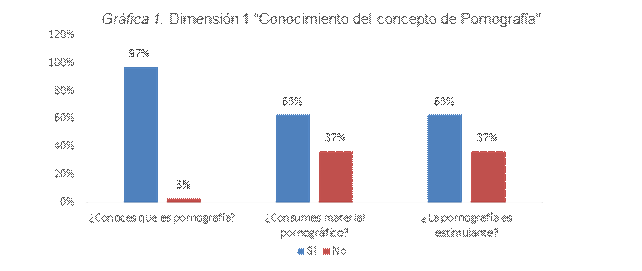 Respecto a la primera dimensión analizada, se puede rescatar que la Pornografía es un tema normalizado dentro del sector juvenil; dado a que la comunidad universitaria ha afirmado que ocasionalmente observa material con contenido sexual acorde a sus preferencias, del cual aseguran que es una conducta normal, necesaria y estimulante para su sexualidad. Esto puede ser visualizado en la gráfica 1 Dimensión 1 “Conocimiento del concepto de Pornografía”.