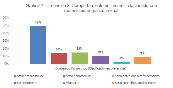 La segunda dimensión nos expone las clasificaciones con mayor consumo por los estudiantes encuestados, asignando como número 1 las relaciones de tipo heterosexual seguida de sexo entre dos o más personas, finalmente las relaciones de tipo violentas, lamentablemente el 9% de la comunidad universitaria, es decir 56 personas asumen que la pornografía infantil es su preferida. Si bien es una estadística baja a la muestra, es alarmante acorde a lo expuesto con correlación entre ofensa sexual y pornografía infantil. Estos datos se pueden contemplar en la gráfica 2. (Gráfica 2. Dimensión 2 Comportamiento en Internet relacionado con material pornográfico sexual).