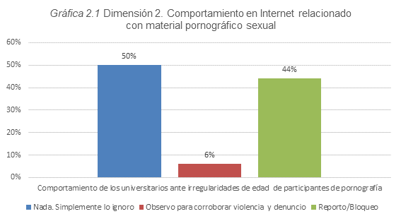 De esta misma dimensión se rescata que el 43 % de los universitarios, es decir 172 estudiantes han percibido que las edades de los participantes en ocasiones no coinciden con su fisonomía, no obstante, la reacción de los estudiantes es nula, debido a la falta de conocimiento de este delito, así como la cultura de la no denuncia. Estos datos pueden analizarse en la Gráfica 2.1, Dimensión 2. “Comportamiento en Internet relacionado con material pornográfico sexual”.