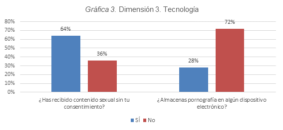 En la tercera dimensión “Tecnología” se establece que el 64% de los alumnos mencionan haber recibido material con contenido sexual sin su consentimiento, hecho que refleja que cualquier persona puede recibir este tipo de material pornográfico, sin importarle su edad, género, sexo o preferencia sexual, manifestando la multidimensionalidad del problema. Esto puede analizarse en la Gráfica 3. Dimensión 3. “Tecnología”.