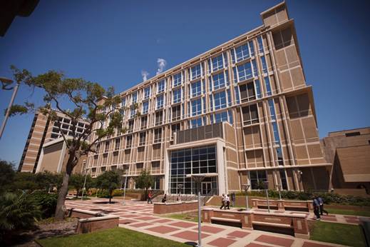 Figura 1. Arriba: Edificio del Galveston National Laboratory (GNL), Abajo: Laboratorio BSL4 de Bioseguridad y Contención Biológica, University of Texas Medical Branch at Galveston, USA. Cortesia UTMB, Dr Scott Weaver y MS. Connie Holubar.