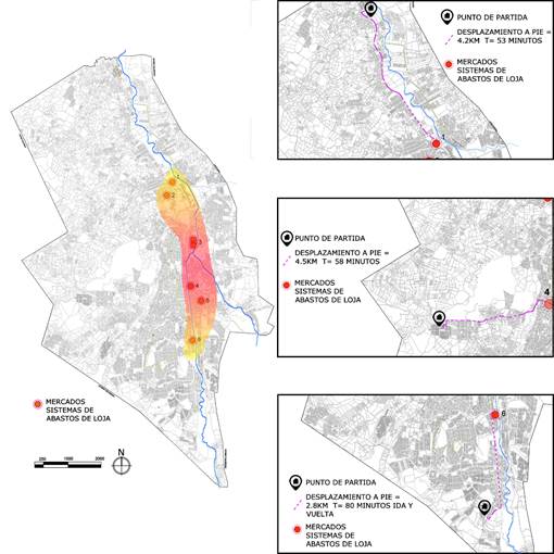 Figura 1. Izq.) Estructura del Sistema de Abastos de la ciudad de Loja, seis mercados en el eje central. Der.) Tres fragmentos ampliados de la ciudad que muestran las distancias y tiempo de recorrido a pie para llegar a los centros de Abastos de la ciudad. Fuente: Elaboración propia