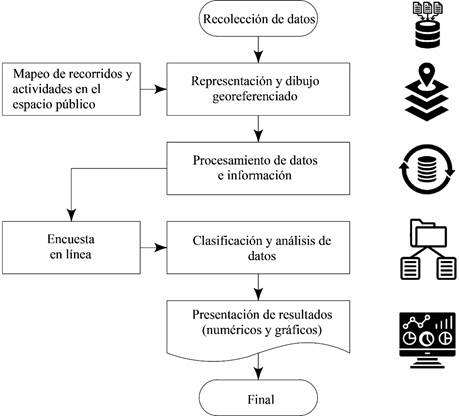 Finalmente, las observaciones y mapeos realizados se correlacionan con los resultados de una encuesta aplicada mediante un formulario en línea a una muestra de la población de Loja (n=272) (N=274112) [24]. La encuesta constó de 13 preguntas en las que se indaga datos generales del encuestado y de los miembros de su núcleo de convivencia; sobre los lugares a los que se desplazaron durante con confinamiento, las distancias recorridas y modos de desplazamiento, y los cambios en cuanto al uso del espacio público a partir de las restricciones motivadas por la pandemia (Ver Figura 2).