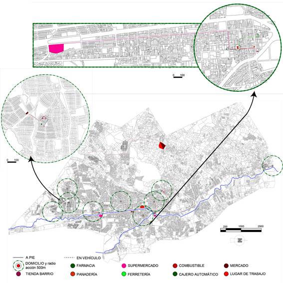 Figura 3. Mapeo de recorridos realizados por el grupo focal durante el confinamiento. Cada círculo corresponde a un núcleo de convivencia, en la parte superior se amplían dos ejemplos. Los círculos tienen r=500 m. Fuente: Elaboración propia.