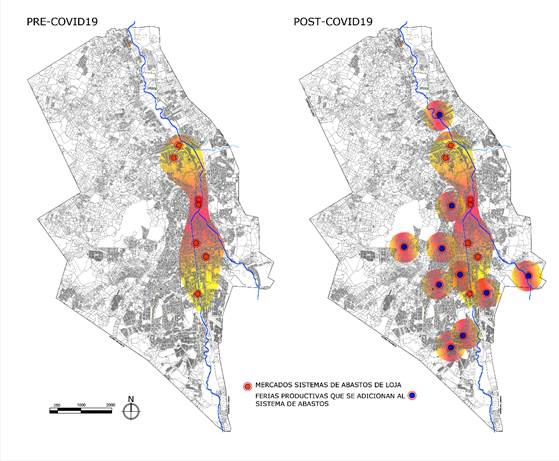Figura 4. Izq.) Sistema de abastos pre-COVID19. Der.) Sistema post- Covid19. A los seis mercados existentes se suman diez mercados barriales o ferias productivas, que funcionan en las canchas cubiertas o áreas deportivas en días específicos de la semana.