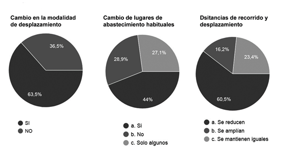 Lo observado mediante los mapeos, se correlaciona con los resultados de la encuesta aplicada. Se evidencia que el 64% de la población cambió la modalidad de desplazamiento con respecto al escenario Pre-COVID19, sin excluir el uso de varias modalidades de desplazamiento, el 65% de la población utiliza vehículo particular, el 51% se traslada a pie y el 22% usa la bicicleta. El 67% de la población cambió los lugares habituales de abastecimiento en su totalidad o parcialmente y un 60% reduce las distancias a recorrer en la ciudad, los lugares principales de abastecimiento son tiendas de barrio y mercados de proximidad en un 91% (Ver Figura 5).
