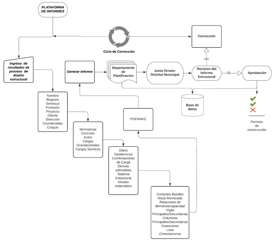 A través de la plataforma profesionales de la ingeniería dedicados al área de la ingeniería estructural podrán generar en línea sus reportes de diseño de estructural. Luego, los datos recopilados en la plataforma al igual que el informe en su formato de documento portátil (PFD) podrán ser enviados a las instituciones encargadas de la revisión y aprobación de diseños. El uso de los datos recolectados posee diferentes aplicaciones potenciales. Por ejemplo, los datos referentes a las características de la estructura son de utilidad para la creación de algoritmos de optimización de estructuras como el presentado en [22] al igual que son de utilidad en el desarrollo de estudios de riesgo sísmico. [23] establece que el acceso a información en el desarrollo de estudios de riesgo sísmico constituye uno de los mayores retos para la evaluación de riego, ya que la precisión de los resultados generados depende de la calidad de los datos.