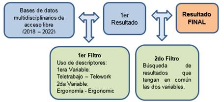 Los documentos académicos analizados provienen de las bases de datos: Alicia, DOAJ, Google Académico, REDIB y Scielo. Mientras que las bases de datos: DIALNET y REDALYC, cuentan con una amplia base de datos académicos en cuanto a las variables teletrabajo y ergonomía, pero no hay referencia actual respecto al estudio en conjunto de las variables, que es objeto del presente artículo.