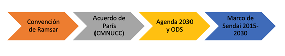 A nivel nacional, Ecuador ha avanzado significativamente en la estructuración de un marco normativo e institucional para la gestión del cambio climático [30]. Desde 1990, Ecuador forma parte de la Convención de Ramsar, se ratificó al Acuerdo de París en 2017, adoptó la Agenda 2030 en 2018 e implementó la Estrategia Nacional de Cambio Climático (ENCC) 2012-2025 y el Plan Nacional de Adaptación (PNA) 2023-2027, siendo estos pasos cruciales en este proceso [13]. Adicionalmente, y desde la perspectiva de la reducción de riesgos de desastres, en 2015 Ecuador firmó el Marco de Sendai, con el cual el país está comprometido con su aplicación, como guía para mejorar todos los esfuerzos futuros [31].