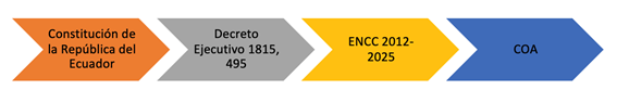 Ecuador, así como algunos países de América Latina, trabaja para diseñar y desarrollar respuestas sostenibles visibles ante los impactos del cambio climático [13] [26]. El país es miembro de la Convención Marco de las Naciones Unidas sobre el Cambio Climático (CMNUCC) y ha suscrito importantes compromisos [1] [12] [27]. Todo el desarrollo del marco legislativo y político para la gestión del cambio climático en el Ecuador se sistematiza de la siguiente manera (Figura 2).