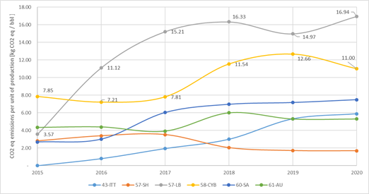 · CO2 emissions per unit of production. This indicator shows carbon dioxide emissions [21] produced by power generation (kWh/year), per barrel of crude oil.