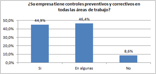 Como se observa en la figura 1, el 44,9% de las empresas realizan controles preventivos y correctivos a todas sus �reas. Sin embargo, el 46,4% ejecutan solamente a algunas de ellas, y el 8,6% no aplican controles a ninguna �rea de trabajo.