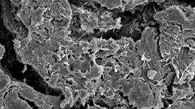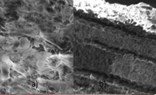 Por otro lado, en la figura 2.a, se muestra la imagen de la microscopia electrónica de barrido (SEM) a 20kV y aumento de 20µm, en esta no se puede ver nada más allá de la capa antes descrita, se observa que se compone como tipos de hojuelas, en la muestra se encontró una rotura lo cual permitió observar su interior en 2.b, también con 15kV y aumento de 50µm, se ve que el recubrimiento tiene surcos donde la fibra se aloja.