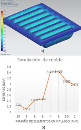 En la figura 6.a, se ve la simulación con un mallado con elementos de 4mm el cual dio el esfuerzo mayor, también en 6.b se observa la gráfica de mallados frente al esfuerzo máximo en cada simulación.
