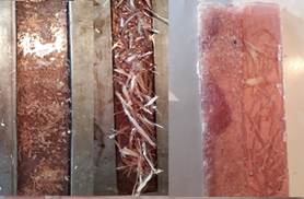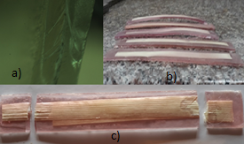 En la figura 1, se muestra las microscopias de inspección de la fibra, en 1.a se ve una cara, donde cada línea longitudinal es una fibra interna y cada espacio entre ellas es una especie de matriz natural, también se ve una rotura de la fibra, comparando en 1.c el anverso y el reverso en 1.b, aquí se ve claramente que el anverso es más resistente y casi no sufre rotura, mientras que el reverso se rompe totalmente, pero se mantiene unido al anverso.