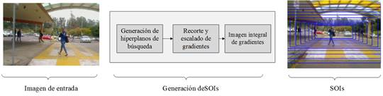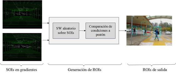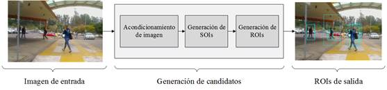 La generación regiones de interés consiste en procesar la imagen de entrada y extraer regiones con alto potencial a contener un peatón [9]. Este proceso es sumamente importante para reducir el tiempo de cómputo y para mejorar los resultados de eficiencia y eficacia en todo tipo de sistema de detección de peatones.