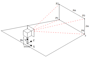 Figura 3. Hiperplano sobre la carretera, donde la cámara se encuentra a una altura fija sobre el vehículo, los puntos P1,P2, P3 y P4 generan .