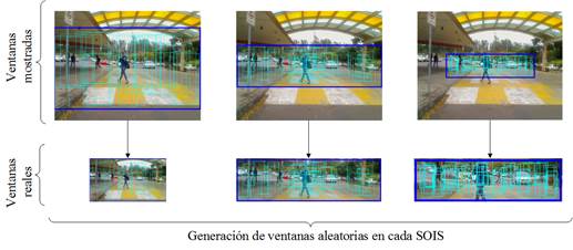 Así, Shou et al [10] han utilizado la técnica Fuzzy C-means para segmentar la imagen y generar un conjunto de ROIs con alto potencial de contener peatones. En otro caso, para detectar peatones a distintas distancias se utiliza SWP en [11]. En [12] se utiliza SWP junto la imagen integral y el descriptor HOG (Histogram of Oriented Gradients), para extraer características y reducir el tiempo de cómputo. En [9] se generan las ROIs haciendo uso de SWP, en una región de la imagen donde el peatón es más propenso a colisionar con el vehículo. En [13] se propone una nueva variación de SW y destinada a realizar el escaneo de toda la imagen con menor tiempo computacional, para lo cual implementa ventanas aleatorias de varias dimensiones, sobre lugares con más potencial a contener peatones, basándose en el teorema de Maximum Search Problems. Para reducir el tiempo de computo se usa la diferencia entre imágenes sucesivas, como se indica [14].