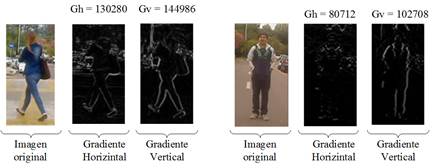 en escala de grises, luego se obtienen la imágenes de los gradientes vertical y